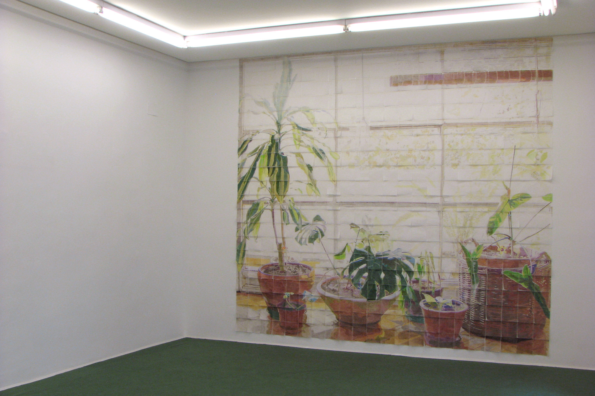 The mural installation is made up of 528 hand-colored paper napkins and references the photographic image of a large window in the living room of her home, in front of which several plants are located, while through the glass it is possible to make out some plants outside. Her interest in this image lies in the possibility of manually reproducing the high contrast of the original photograph, which causes the exterior to be overexposed in order to correctly expose the objects arranged inside the room.