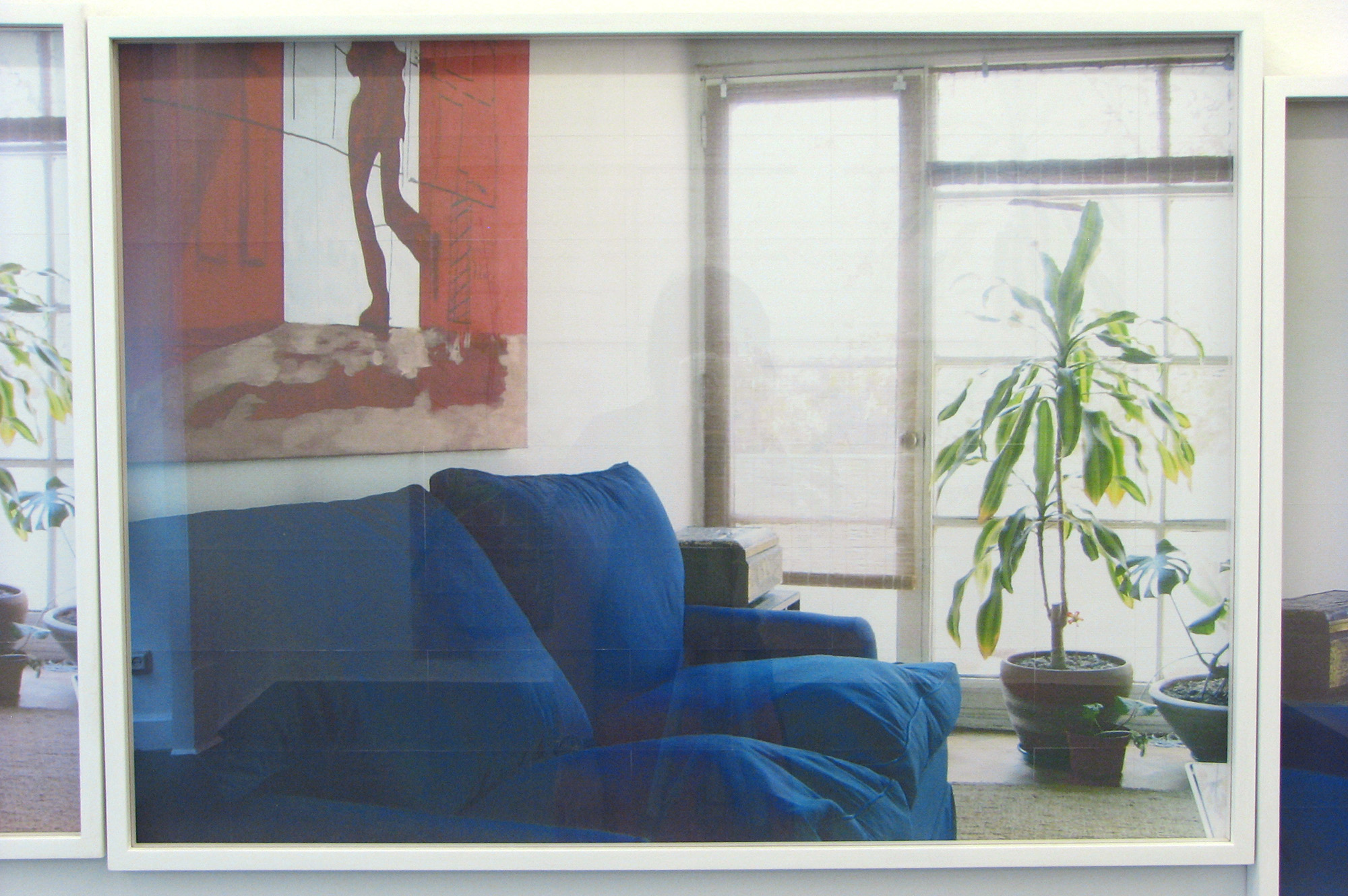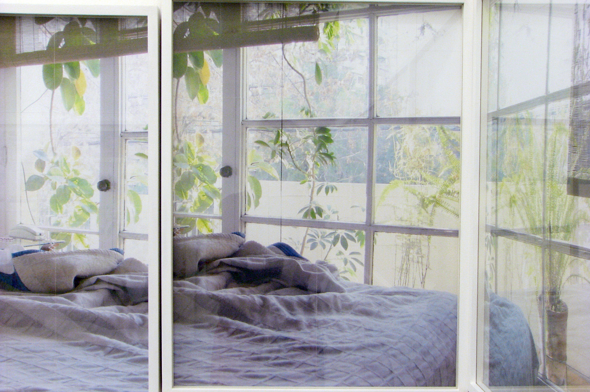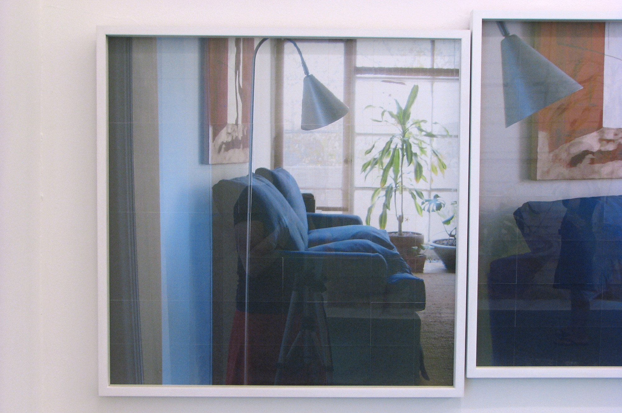 La serie de fotografías es parte de una secuencia que reproduce el recorrido en panorámica desde un dormitorio, su cama, mesa de noche, ventana, plantas, mueble del televisor, librero, pasando por el pasillo, el sofá del living, hasta llegar al ventanal de ese espacio. El montaje lineal de las fotografías crea una continuidad espacial que, sin embargo, se ve interrumpida por la superposición de fotografías en las cuales se producen descalces en los encuadres. Estas fotografías están impresas a inyección de tinta en módulos de 14 x 14 cm de papel de acuarela. El resultado cromático y textural de dichas imágenes impresas se asemeja al de las acuarelas, de modo que es posible establecer un cruce con ese medio pictórico.