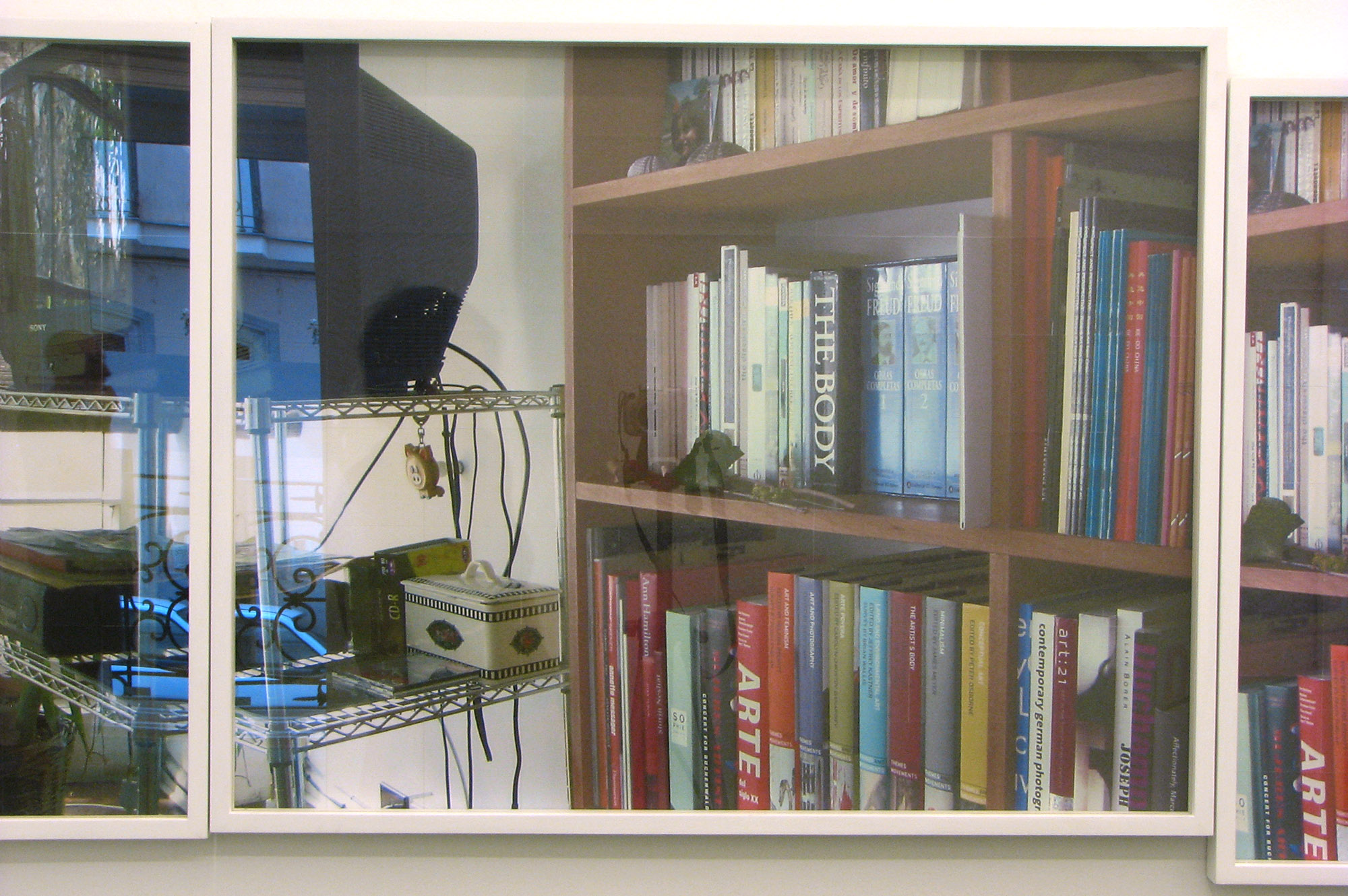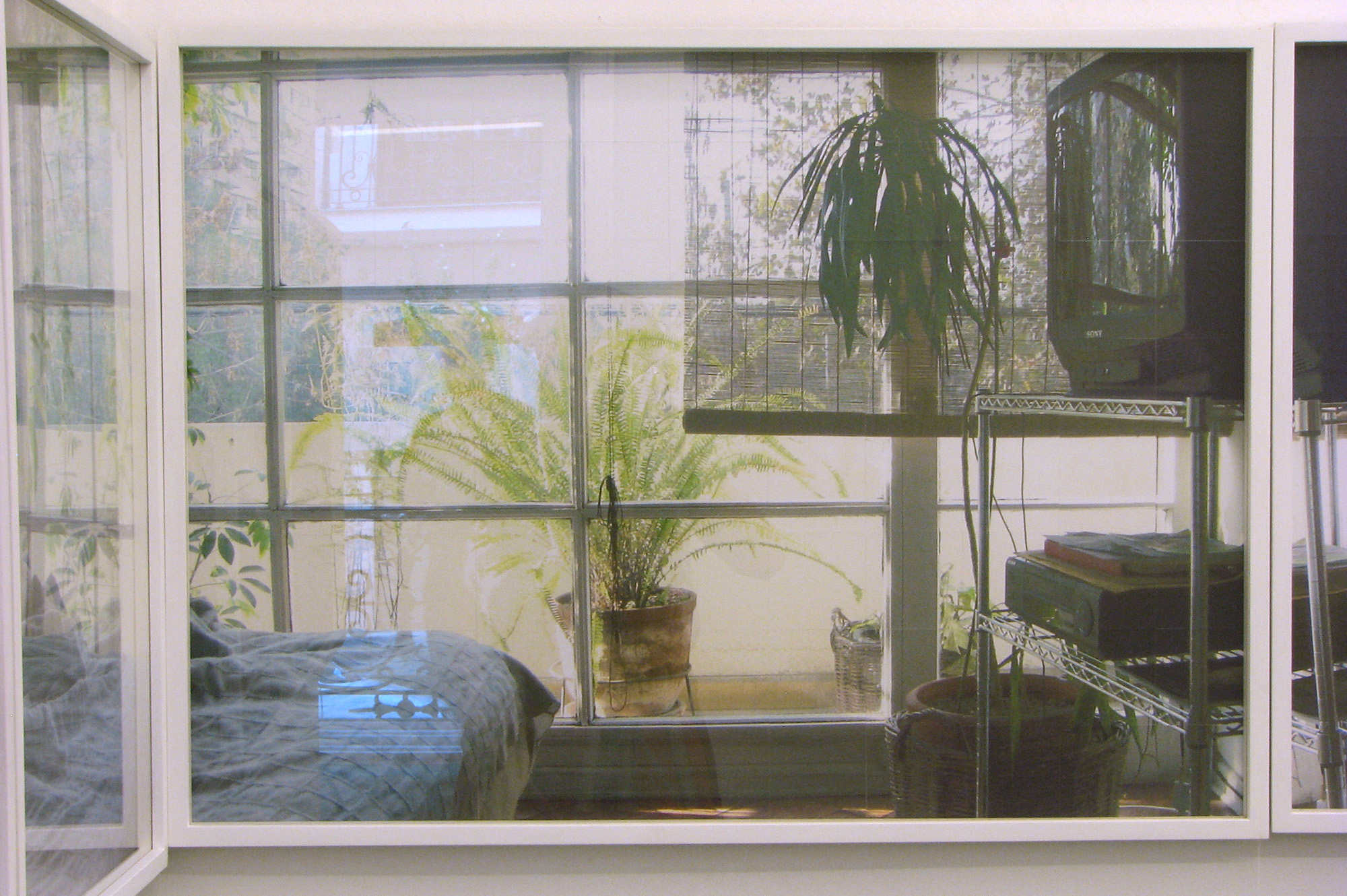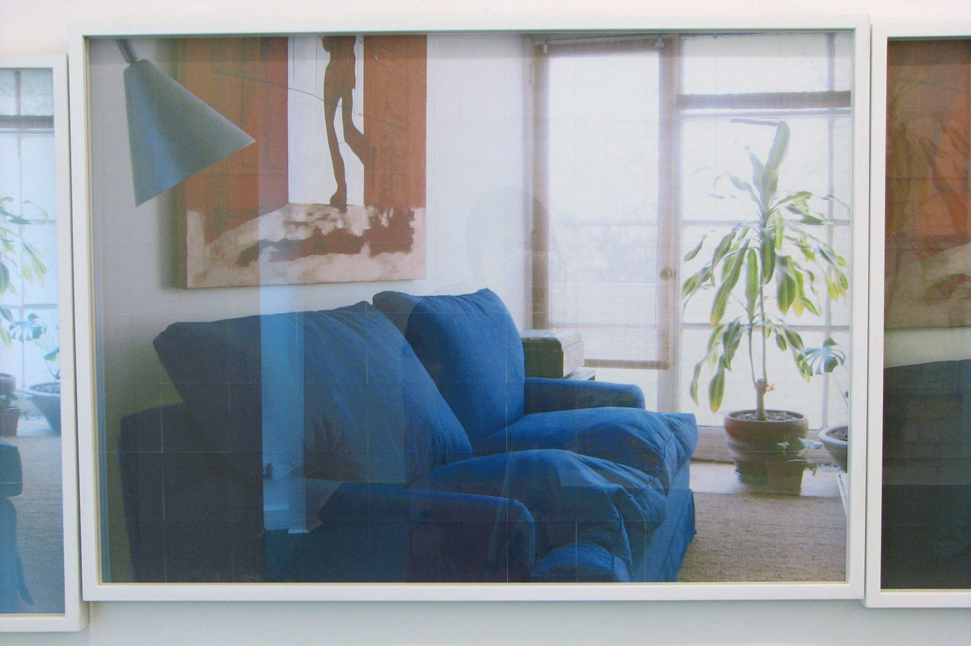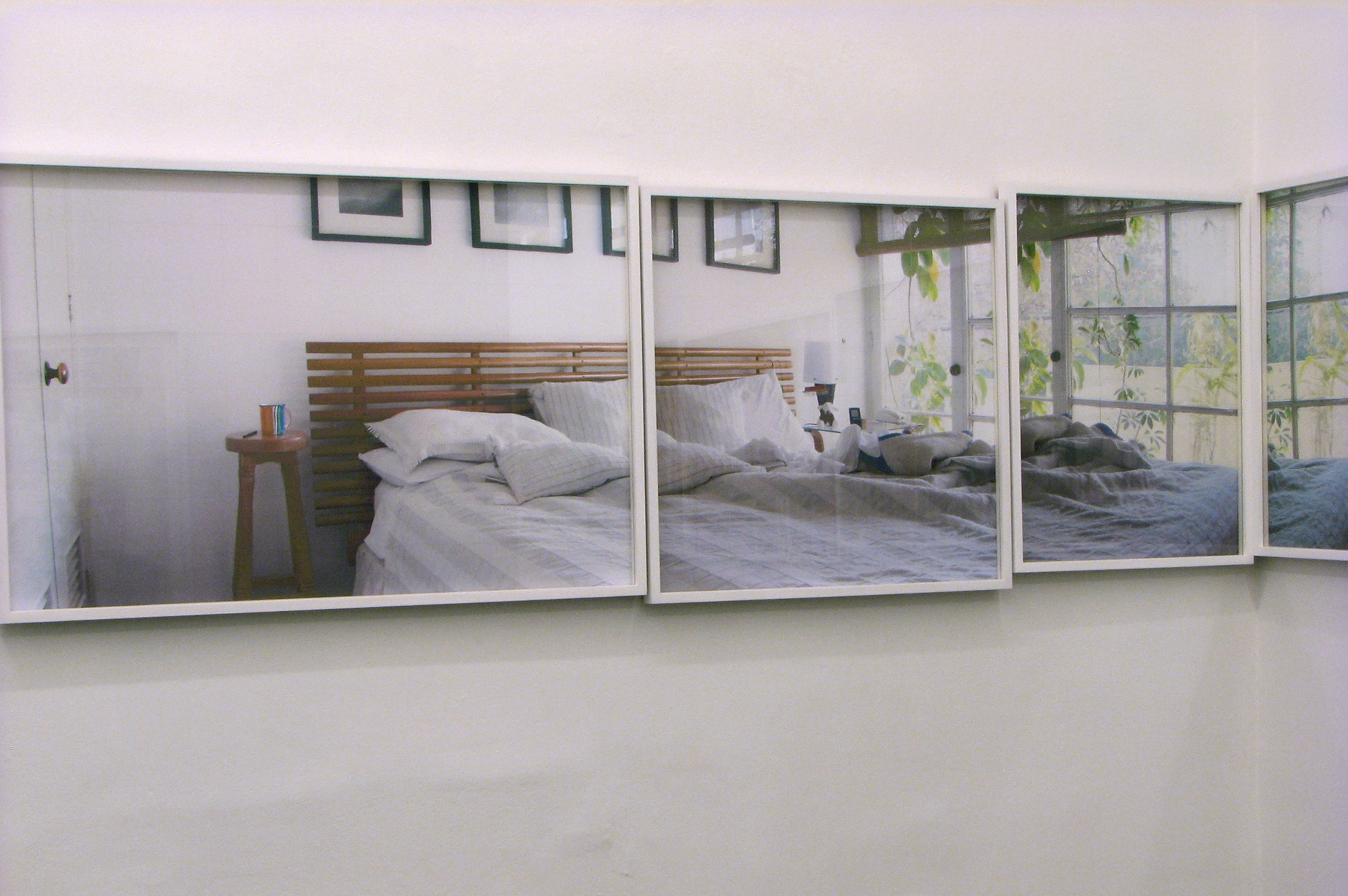 La serie de fotografías es parte de una secuencia que reproduce el recorrido en panorámica desde un dormitorio, su cama, mesa de noche, ventana, plantas, mueble del televisor, librero, pasando por el pasillo, el sofá del living, hasta llegar al ventanal de ese espacio. El montaje lineal de las fotografías crea una continuidad espacial que, sin embargo, se ve interrumpida por la superposición de fotografías en las cuales se producen descalces en los encuadres. Estas fotografías están impresas a inyección de tinta en módulos de 14 x 14 cm de papel de acuarela. El resultado cromático y textural de dichas imágenes impresas se asemeja al de las acuarelas, de modo que es posible establecer un cruce con ese medio pictórico.
